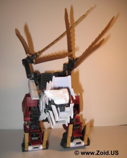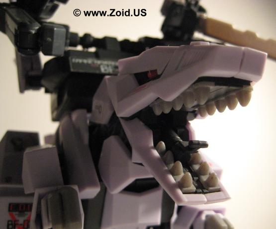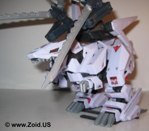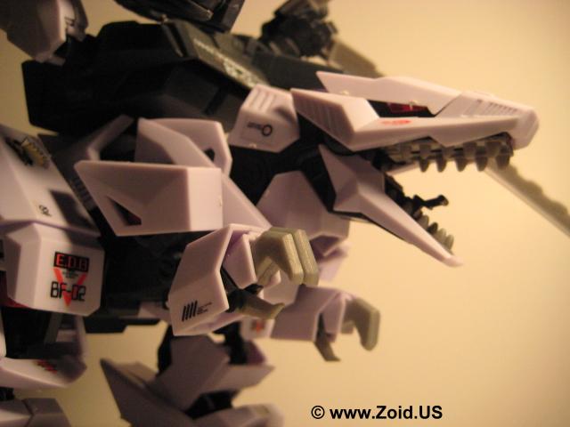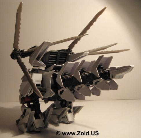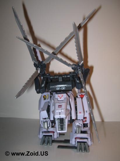Another similarity Berserk Fury shares with the Death Saurer is it's ability to mount and use the dreaded Charged Particle Cannon. It's secondary weapons are a pair of highly visible claws known as Buster Claws (and deemed by fans as "egg beaters"). Each claw possesses not only one but three distinct abilities. The first function is to act as a powerful beam cannon when the Charged Particle Cannon cannot be used, or in support of said cannon. The secondary function is to provide defense by enabling the unit to enact an "ES" or Electrical Shield first seen on shield like and later seen on Zoids like Gojulas Giga. Last but far from least the Buster Claws enable the Berserk Fury to channel energy into the Charged Particle Cannon to further enhance it's devastating effects.