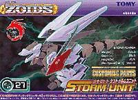 Berserk Fury also sports a pair of "Strike Claws" which can be used similar to those of Liger Zero. Additional weaponry includes: Electron Fangs and it's Strike Smash Tail. Equipment wise Berserk Fury has a Charged Particle Generator, ten vernier thrusters, two high maneuver thrusters, and ion booster pack, and four anchors. The anchors are located on the back of the Zoids feet and are used to stabilize the unit as it prepares to fire the massive charged particle cannon. The downfall of the Berserk Fury possessing the Charged Particle Cannon is that it must remain anchored in the same place to properly fire the cannon due to the high recoil of the blast. Berserk Fury is also capable of using a changing armor system or "CAS". Known as the CP-27 or "Sturm Unit" it removes the Buster Claws while increasing the speed from a 211 miles per hour to an incredible 280 miles per hour maximum. In lieu of the Buster Claws the CP-27 lends the Berserk Fury a pair of claws similar to the Geno Breakers X - Breakers.