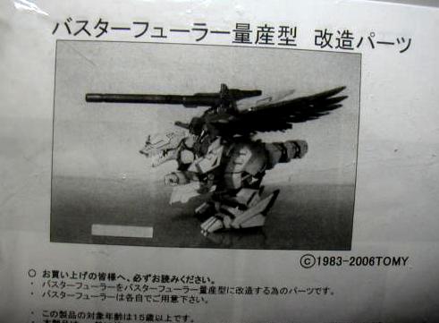 The last release of Berserk Fury was the Fuzors edition titled Buster F�hrer. The backpack was modified on this unit to fit the Buster Eagle that came standard with the unit. The feet were also changed enabling the unity to walk properly with the Buster Eagle atop the unit. Buster F�hrer came with an Anime accurate mini figure of Blake and had a re-vamped sticker sheet. Somewhere between 2001 to 2004 there were some chrome examples of Berserk Fury. I believe these were old Leo-Shop chromes. They are seldomly seen, and do make for glorious display units.