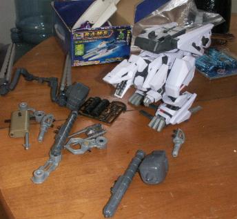I wanted to redo the weapons systems also so I looked at what I had around the house and came up with an old Revell "RAMS" Wave Warrior. In this kit I found two awesome guns that looked to be about perfect for shoulder mounted weapons. I scavenged some more and came up with two large tubular pieces that I thought would look great as large primary cannons to replace the blades or "Buster Claw" units. Almost finished, I found two jet booster packs with turbines. Now I am in business.