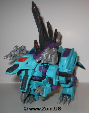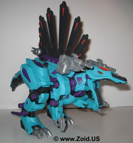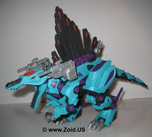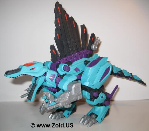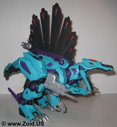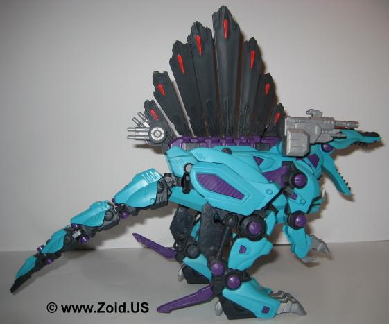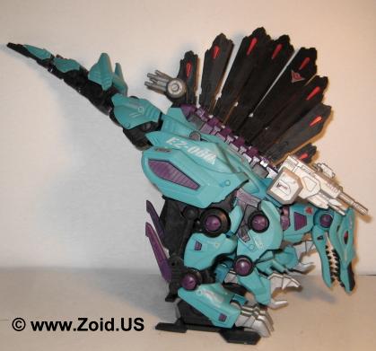 Dark Spiner is a Spinosaurus type Zoid created by the Empire. Based on Dimetrodon, and designed to function in a similar manner, Dark Spiner is an electronic warfare Zoid. Taking a look at this Zoid, it's obvious that the focus is on the large spines that adorn it's back. Collectively they are known as the "Jamming blade array", and have the ability to interrupt, interfere, and disable an opponents communication systems, sensory systems, targeting, and radar systems. The Jamming blade array can also emit a Electromagnetic Pulse or "EMP" blast, as well as create an ionization field that acts similar to an Electric Shield. Dark Spiner is equipped with two 144 mm machine guns, a double barrel cannon, strike laser claws, and a strike smash tail. Not an overly impressive arsenal, but not designed to be as Dark Spiner's main role is that of a support Zoid lending it's talents to help Zoids with a more capable direct damage weapons. Dark Spiner is the best Zoid design ever produced in terms of it's electronic warfare capabilities.