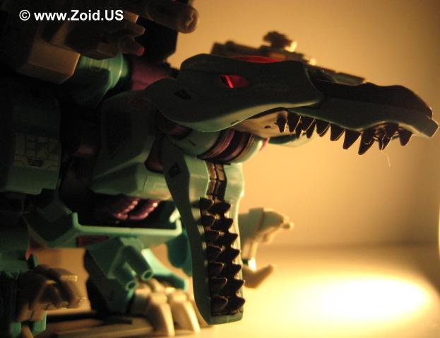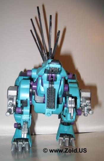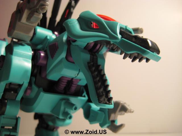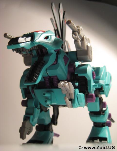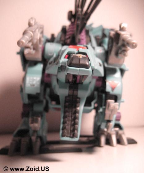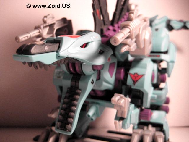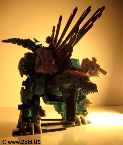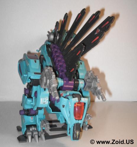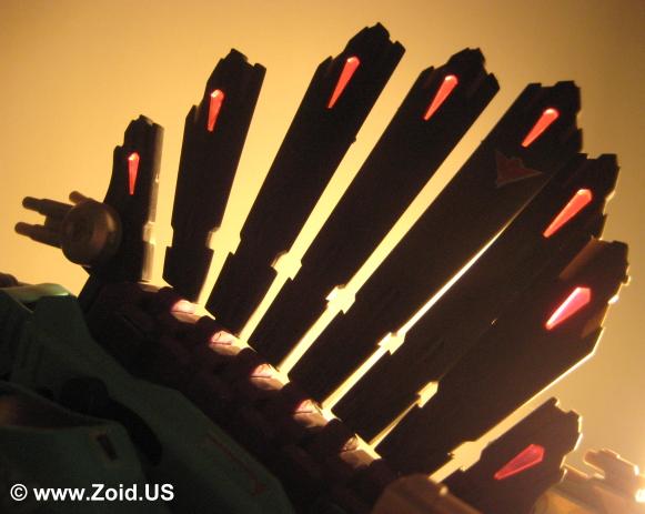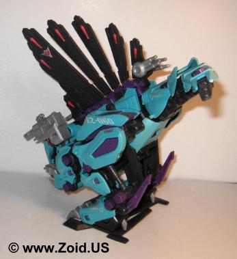 Dark Spiner is not an overly difficult model to build. Like the other bipedal Zoids Dark Spiner is a semi-long build but lack a huge amount of small pieces. Dark Spiner has two selectable modes. In the first "normal" mode, Dark Spiner walks forward, while swinging it's tail and arms, as the jamming array ripples back and forth. The second "Electronic Warfare" mode Dark Spiner stays stationary with only the jamming array animating. At first, I really didn't groove on this unit but it does tend to slowly cultivate an interest. I currently have two in my collection at the present time. Each fin on the jammer array sports a small piece of translucent pinkish plastic near the top that picks up light nicely when displaying the piece. The two shoulder mounted gun attach over a cap, almost as if they were an afterthought on the design. Dark Spiner can be displayed with it's head down, making a ferocious appearance that stands out amongst other units. This unit can be found with ease, as it sold very poorly and often picked up for under $20.00 US.