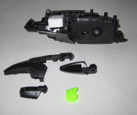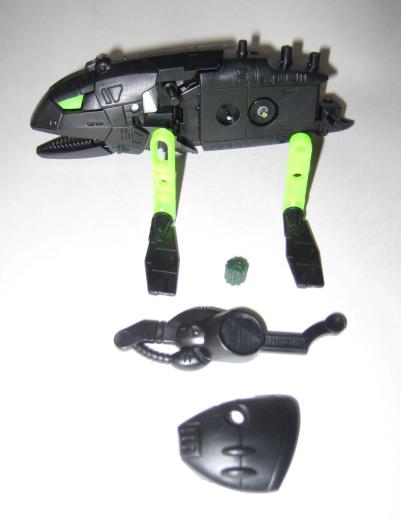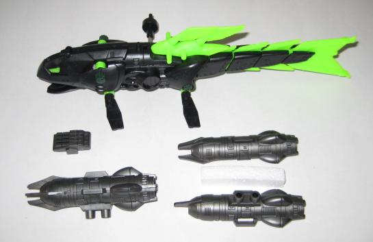 The tail is attached and held in place by a top plate. Two more side guard plates and two top fins are inserted.