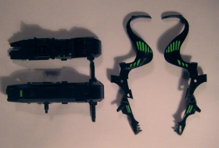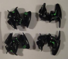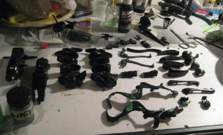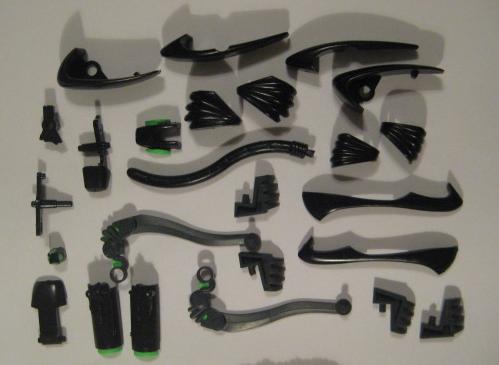 The paint process took 2 days, and I let the pieces completely dry (another 2 days). I went back three times to "clean up" the green, and tighten up the lines so they looked both natural and original. I truly believe that trying to mimic and existing Zoid pattern is more complex than doing a custom from scratch. I have about 50 hours into the piece total. Below are the dry, finished pieces ready to assemble.