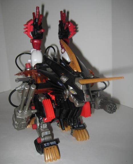 The Energy Liger build is also unique. Although it is based on a normal Liger frame, the unit makes use of battery powered air pump representing the Energy Charger. The Energy Charger consists of two large bellows that supply air " tachyon particles" to the Liger's movement or weapons system. The mode can be selected and as a result of selecting the movement mode the air travels through the tubes and into the wings allowing the wings to fold and unfold as the unit walks forward. The real treat is when the weapons system is selected. The air is directed to the weapons successfully setting the charger gattling spinning and animating the dual charger cannon which pulsates back and forth. Being one of few antagonist Liger's the Energy Liger is an excellent piece to add to your collection. The animation on this piece is truly a sight to behold, and puts most "modern" toys to shame with it's air pump technology. The armor holds on surprisingly well, and my piece does not shed at all. } The colors compliment each other very well, and it is worthy to note the distinct ancient Zoidian runes found on the horn which are later seen in the Genesis line on pieces like Gil Dragon. Perhaps foreshadowing proof that the Energy Liger was indeed the legendary "Alpha Zoid"? Although becoming a bit on the rare side you can still land this bad ass for around $40.00-$50.00 US, and it's worth every last penny.