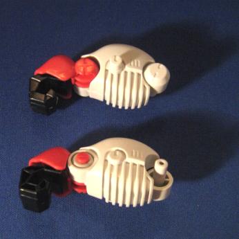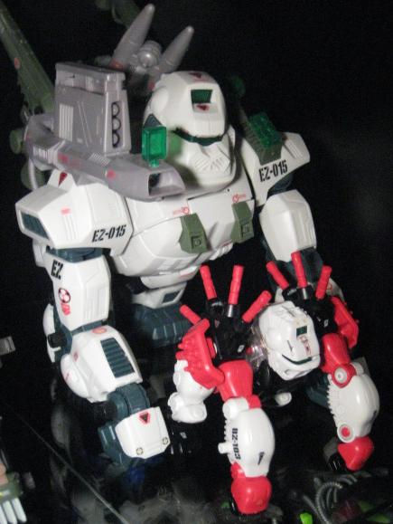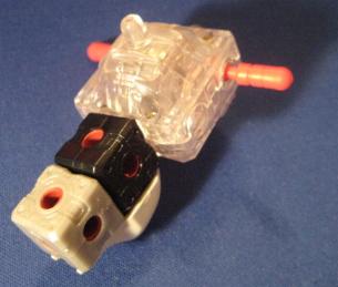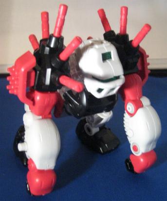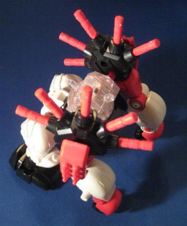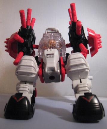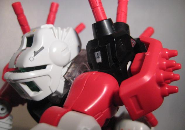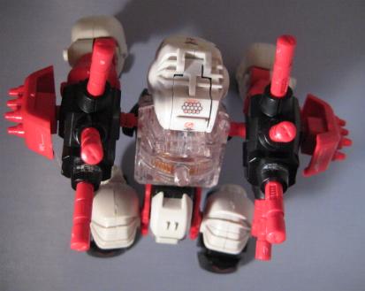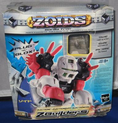 Gorilla Tron is a Hasbro exclusive release. I think it is another example of an "overlooked" Blox Zoid. Gorilla Tron shares the same flashing light center piece pseudo blox unit as Ray Saurer, and that's about the only "gimmick" it has, yet this Gorilla really shines in design and build. If you take a close look at the box you can see a few minor differences mainly on molding of the head unit. The unit pictured on the box has an extra "ridge" that, while not necessary, provides a little bit more depth and detail as well and gives a distinct surface to sticker. The build is simple yet, for some reason, very fulfilling. I truly enjoy the missile ports that adorn each shoulder. On the downside there are VERY few stickers pictured on the box that this unit actually comes with. It makes for a nice night of playing "lets search through the sticker bin, all night", but does get irritating. Let's take a closer look at BZ-103.