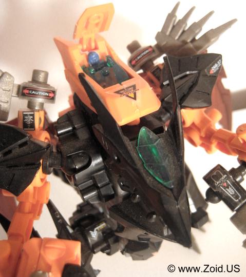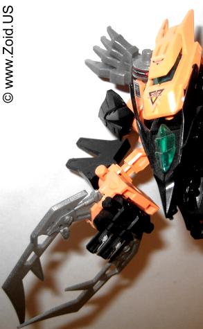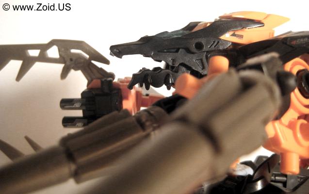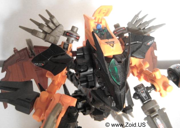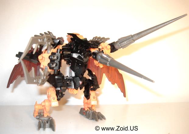 Lord Gale also has a plethora of weapons including "Hell's Fang" which (name wise) strikes a very similar resemblance to Deadly Kong's "Hell's Box". He is also equipped with a set of spears referred to as Magnesser spears on his right "hand", and a very crustacean like Magnesser claw on his left "hand". Strike Claws, X Scissors, a Magnesser tail, and a double barrel cannon make up the rest of Lord Gale's arsenal. The "Magnesser" material is usually found on aerial Zoids and "translates" roughly to a magnetic repulsion system allowing flight. Magnetic repulsion was Zoidian technology that allowed lift and propulsion as well as both vertical take off and landing capabilities. It is also said to have very low maintenance requirements allowing the Zoid in possession of Magnesser armaments an extreme amount of in flight time before having to be serviced. I'm speculating that Lord Gale used it's tail as a rudder, and it needed to be just as capable of performance as did the wings thus it is also listed as being composed of Magnesser.
