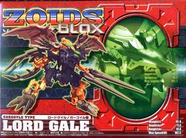 In 2003 Lord Gale was introduced into the Blox line, and later that same year Lord Gale was given the Yuji Kaida treatment and dubbed "Saint Gale". Sometime after this, Lord Gale was released as a Holo Tec Zoid and sold as a convention exclusive. This Holo Tec release is very rare and has come to be known as "Disco" Gale due to the bright color scheme of the translucent plastic. The final formal release was part of the Fuzors line where Lord Gale sported new Savage Hammer stickers and was re-colored in bright orange along with a red pilot. Lord Gale was last seen as part of the Zoids:Generations where he was ameliorated with buster wings, a shield / gattling gun combo, and gun blade as pictured below: