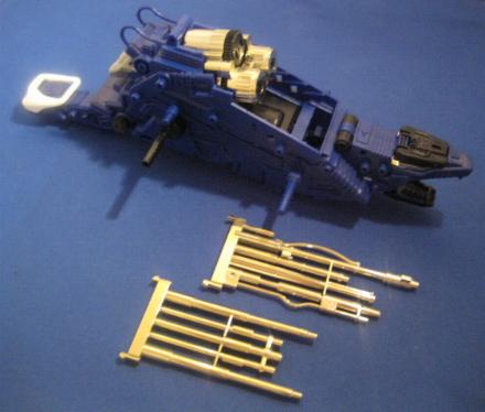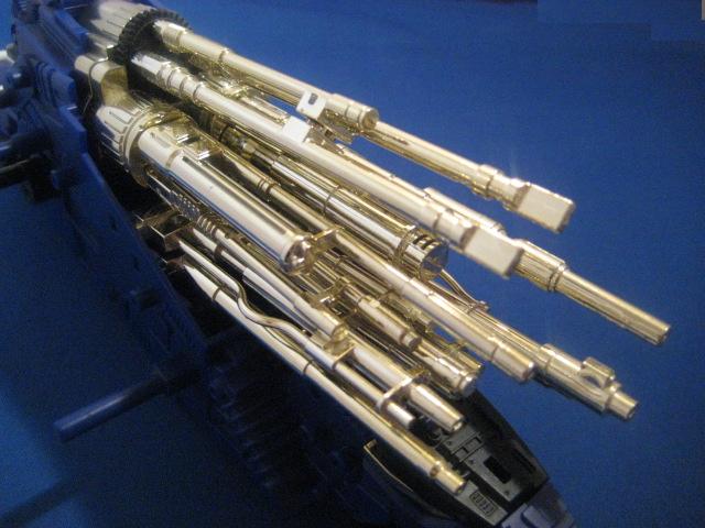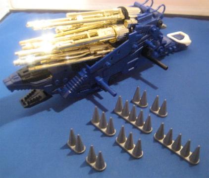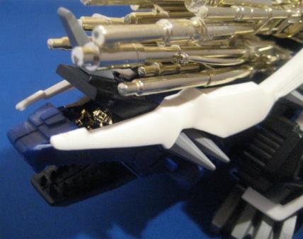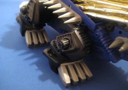 Gun Bluster has always been one of my favorite Zoids. I have always (lovingly) referred to the unit as "The God of Gats". Although this is not part of the Grade Up series, it does sport some wicked chrome work. Designed as a support unit to release a barrage of fire, Gun Bluster has an array of weaponry built into its back. The 22 golden barrels plus large spikes that adorn both sides of the unit make one hell of an impressive Zoid. Lets take a look at the OJR version of Gun Bluster.