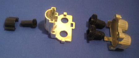 In the next step the motor, gear box, battery cover, on/off switch, jaw pieces, a couple caps, and jaw operating rod are placed. Below is an exploded view.