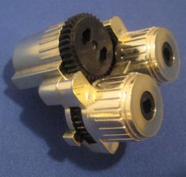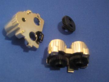 The gear box is assembled using the three gears pictured above, the gear pictured below, gear cover, and the actual box that houses them all.