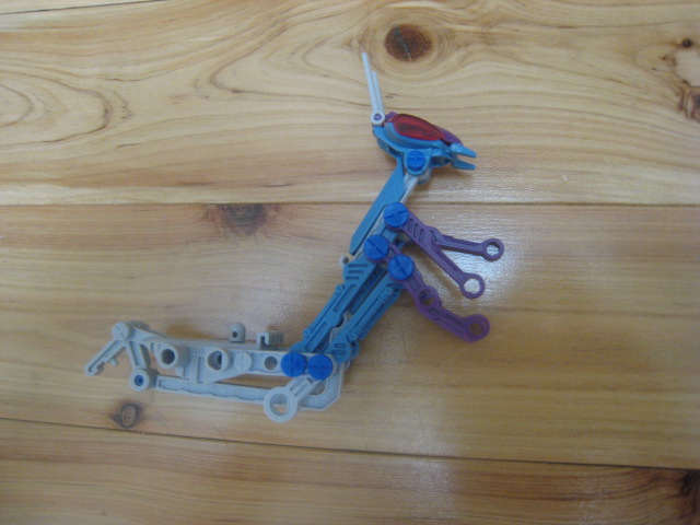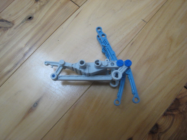 The back legs are then created. This is where we see the use of the power band employed. A very interesting concept that uses tension to create action. Note the various pegs that are placed through the main leg piece that is riddled with different sized holes.